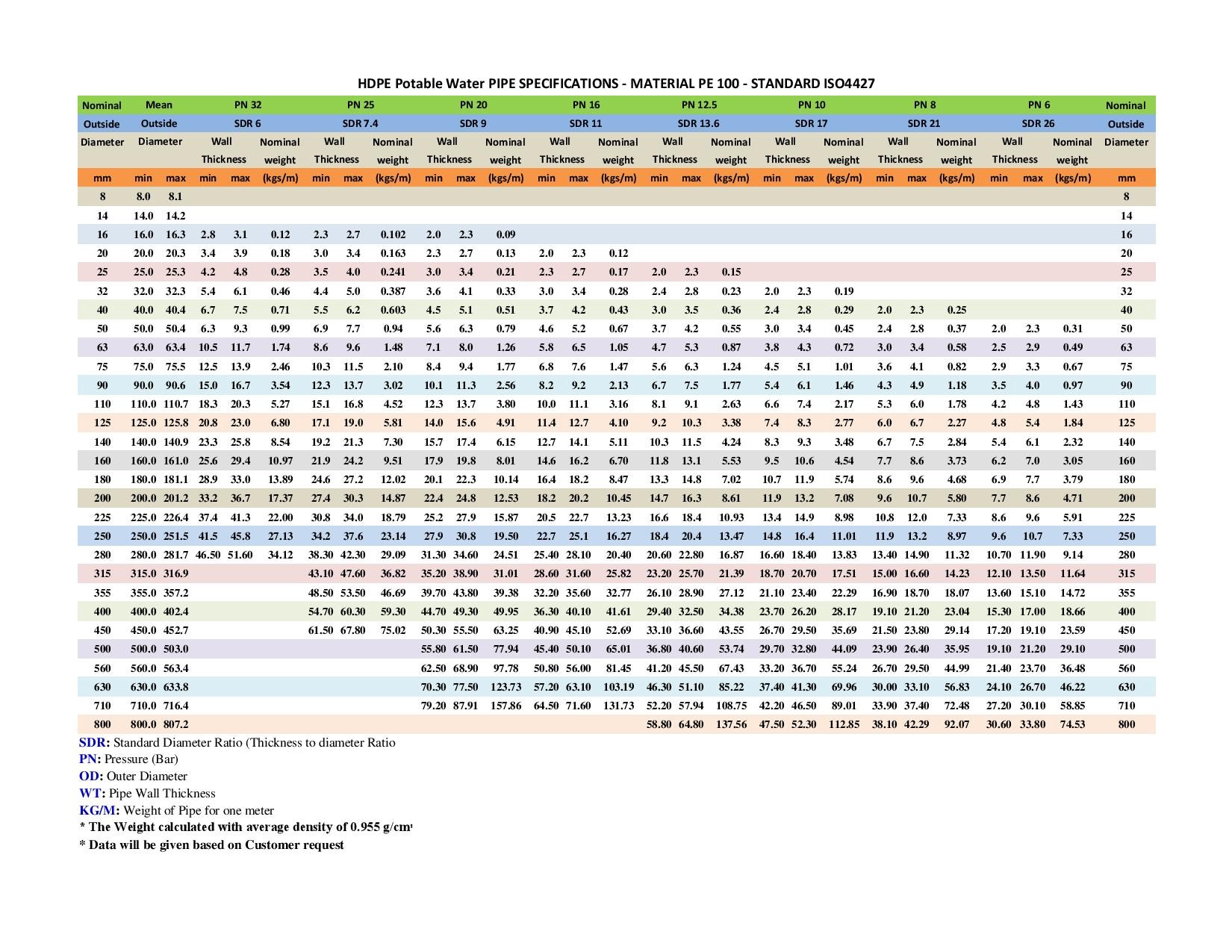 - Different pressures, from 6 bar (SDR 26) to 16 bars (SDR 11).